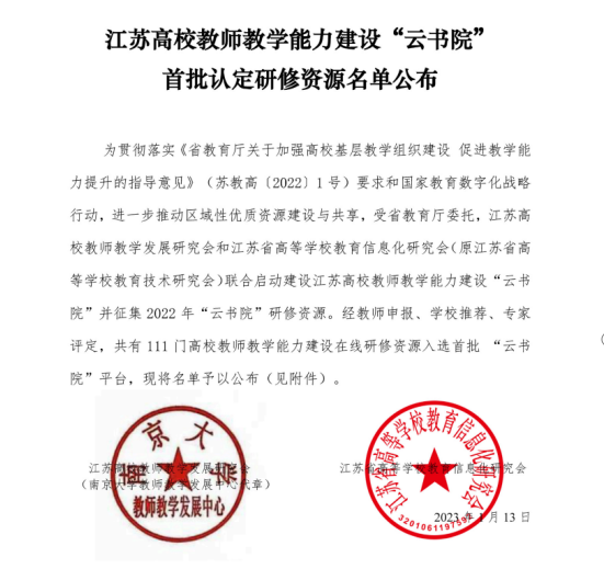 近日,江苏高校教师发展研究会、江苏省高等学校教育技术研究会公布了江苏高校教师教学能力建设“云书院”首批认定研修资源名单,我校《大学数学答疑释惑专题》和《数字逻辑电路》2门教学资源成功入选“云书院”平台,入选数量在全省同类高校中位居首位!