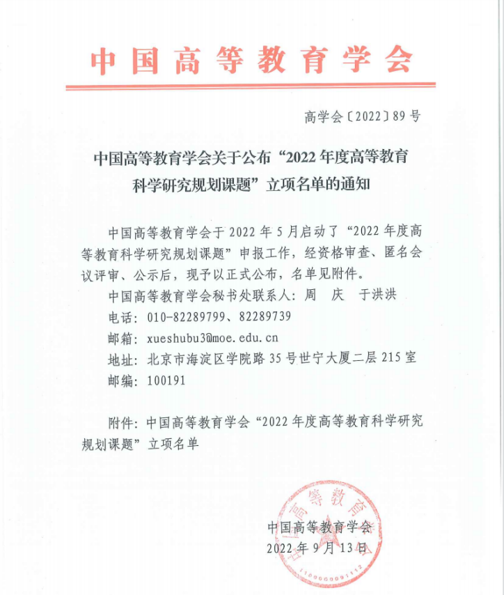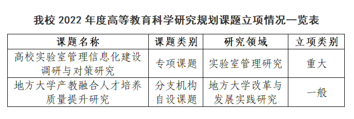 近日,中国高等教育学会公布了2022年度高等教育科学研究规划课题立项名单,我校获批2项,其中重大项目1项、一般项目1项。立项数在全省同类高校中位居首位,也是同类高校中唯一一所获批重大课题的学校。