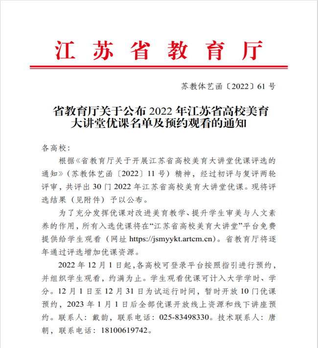 省教育厅关于公布2022年江苏省高校美育大讲堂优课通知