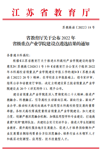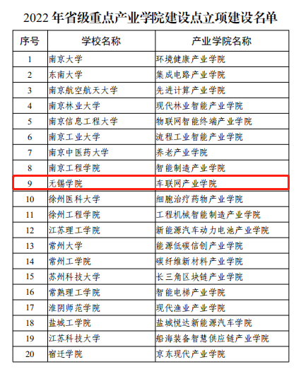 近日,江苏省教育厅发布了《省教育厅关于公布2022年省级重点产业学院建设点遴选结果的通知》(苏教高函〔2022〕18 号),我校车联网产业学院获批2022年省级重点产业学院建设点。本次申报共有40余所本科高校参与,经过激烈角逐我校脱颖而出,获批最终的20个省级重点产业学院建设点。