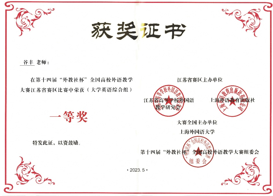 5月13-14日,第十四届“外教社杯”全国高校外语教学大赛江苏省赛区决赛在宿迁学院举行。江苏省赛区比赛设大学英语综合组、大学英语视听说组、本科英语专业组、研究生英语组等,来自东南大学、南京师范大学、南京航空航天大学等院校的95名选手和团队进入了本次决赛,与往年相比呈现出人数明显增多、竞争难度加大的态势。我校人文法政学院副院长赵岚带队,谷丰、魏文两位教师参加了此次决赛。经过激烈角逐,我校教师凭借扎实的专业功底、良好的教学设计能力和出色的课堂教学水平分别获得大学英语综合组一等奖第一名和本科外语类专业组二等奖,取得我校在该项赛事上的历史性突破。