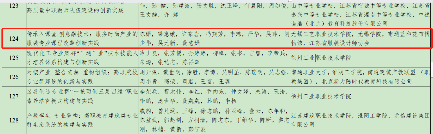 日前,《教育部关于批准2022年国家级教学成果奖获奖项目的决定》发布。我校杨建新教授团队申报的教学成果“校企协同构建服务“一带一路”人才培养命运共同体的探索与实践”、梁惠娥教授团队申报的教学成果“传承入课堂,创意融技术:服务时尚产业的服装专业课程改革创新实践”喜获2022年职业教育国家级教学成果奖二等奖,是我校历史上国家级教学成果奖的重大突破!