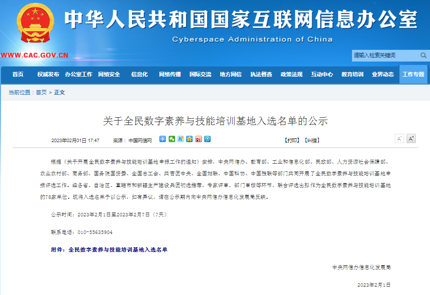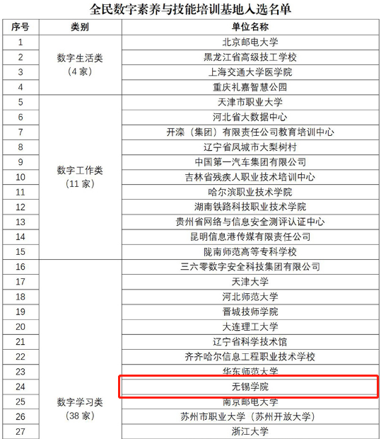 根据《关于开展全民数字素养与技能培训基地申报工作的通知》安排,中央网信办、教育部、工业和信息化部、民政部、人力资源社会保障部、农业农村部、商务部、国务院国资委、全国总工会等部门共同开展了全民数字素养与技能培训基地评选工作。经初选推荐、专家评审、部门审核等环节,联合评选出全民数字素养与技能培训基地78家。此次顺利入选,是我校主动服务网络强国、数字中国建设,融入无锡地方产业办学的重要体现,也是我校深耕高素质网信人才培养的又一重大突破!