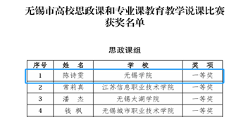 10月17日,无锡市教育局、无锡市哲学社会科学界联合会公布了2023年无锡市高校思政课和专业课教育教学说课比赛决赛结果,我校入围决赛的两名教师全部获一等奖。马克思主义学院陈诗雯老师荣获思政课组一等奖,轨道交通学院董伟光老师荣获专业课组一等奖。
