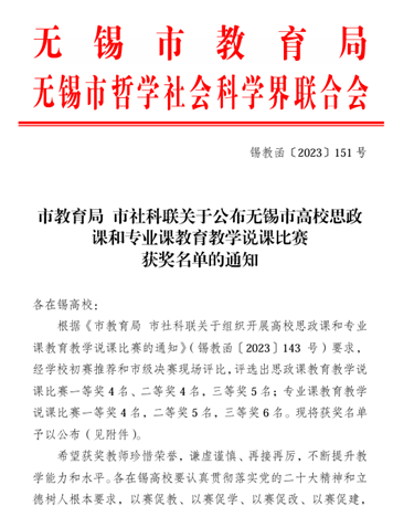 本次大赛是由无锡市教育局、无锡市哲学社会科学界联合会主办,以“深悟嘱托担大任砥砺奋进建新功”为主题,围绕“赓续中华文脉、坚定文化自信”“实施科教兴国战略、强化现代化建设人才支撑”“谱写‘强富美高’新江苏现代化建设新篇章”三个选题中的一个选题,从说教材和教学内容、说教法和学法、说教学过程、说教学反思等四个环节进行展示。大赛设有思政课组、专业课组两个类别,参赛教师聚焦专业特点和育人要求,充分挖掘课程中的思政元素,以思政引领人才培养。本次比赛评选出思政课教育教学说课比赛一等奖4名、二等奖4名,三等奖5名;专业课教育教学说课比赛一等奖4名,二等奖5名,三等奖6名。