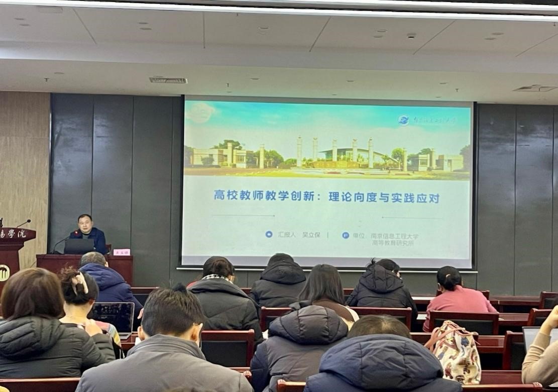 为进一步提高我校教师的教学能力、创新能力和专业化水平,打造一支高素质、创新型、专业化的教师队伍,同时引领教师更好地备战第四届全国高校教师教学创新大赛,12月20日下午,教务处特邀南京信息工程大学吴立保研究员作《课程教学创新——理论诠释与实践应对》专题讲座,讲座由教务处副处长裴晓芳主持,学校第二届教师教学创新竞赛的参赛教师和部分新进教师参加讲座。