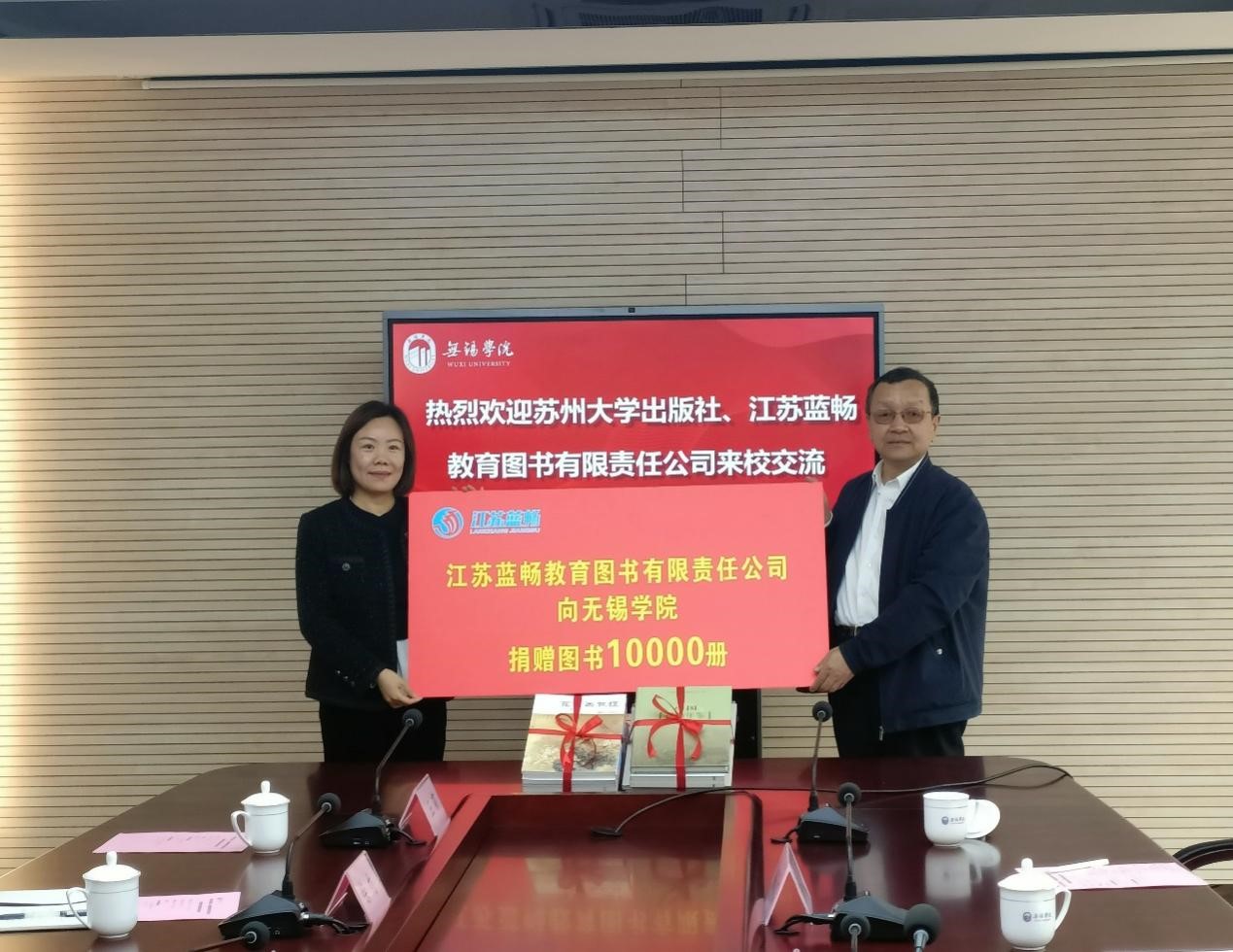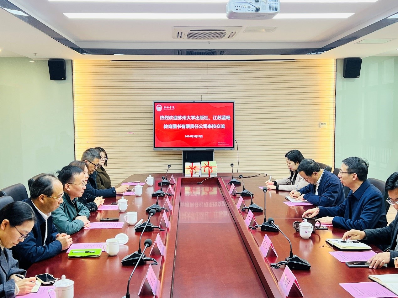 3月26日上午,苏州大学出版社、江苏蓝畅教育图书有限责任公司来校出席赠书交流会,苏州大学出版社社长蒋敬东、江苏蓝畅教育图书有限责任公司总经理李婷,副校长曹广喜、教务处、图书馆(档案馆)馆长负责人及骨干教师、相关工作人员出席了会议。