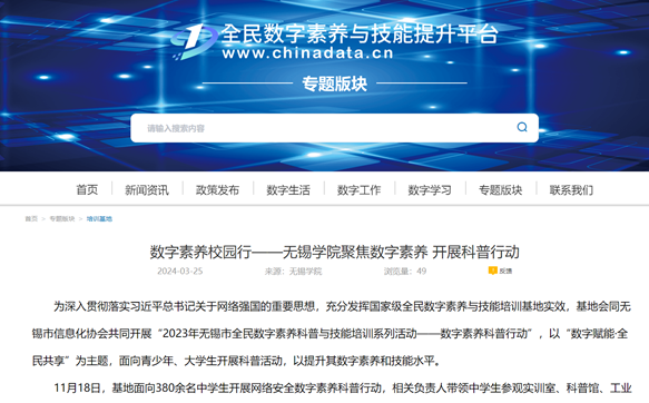 2024年3月25日,中央网信办全民数字素养与技能提升平台专题报道我校开展“2023年无锡市全民数字素养科普与技能培训系列活动——数字素养科普行动”。本次科普行动以“数字赋能·全民共享”为主题,面向青少年、大学生开展科普活动,提升青年学生数字素养和技能水平,主要包括参观实训室、科普馆、工业互联网实验室等多个特色场所,面向大学生群体聚焦数字道德伦理规范、数字安全保护等内容开展数字素养科普讲座,涉及500余人次。