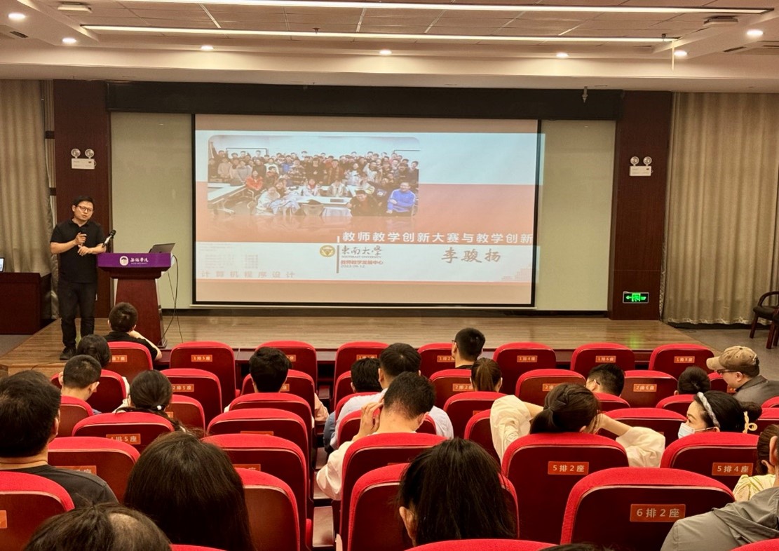 6月12日下午,新教师培训第八期专题讲座在我校行政楼227报告厅举办。讲座特邀首届全国高校教师教学创新大赛一等奖、江苏省教师教学创新大赛特等奖获得者---东南大学李骏扬副教授为新教师开展“教师教学创新大赛与教学创新”主题分享。本次讲座由教务处、教学评估中心副处长李燕飞主持。