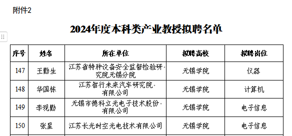 近日,江苏省产业教授选聘办公室公示了2024年江苏省本科类产业教授(兼职)选聘结果。我校推荐的江苏省特种设备安全监督检验研究院王勤生、江苏智行未来汽车研究院有限公司华国栋、无锡市德科立光电子技术股份有限公司李现勤、江苏长光时空光电技术有限公司张星4名企事业专家成功入选。