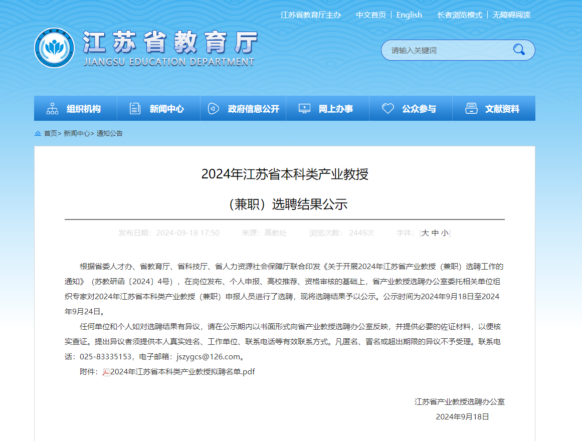 江苏省产业教授选聘工作是江苏省实施新时代人才强省战略,进一步深化校企合作,推进产教融合,实现高校与行业企业资源的优势互补和同频共振,有效提升高校学科专业建设、人才培养、科学研究、成果转化水平和能力的重要举措。