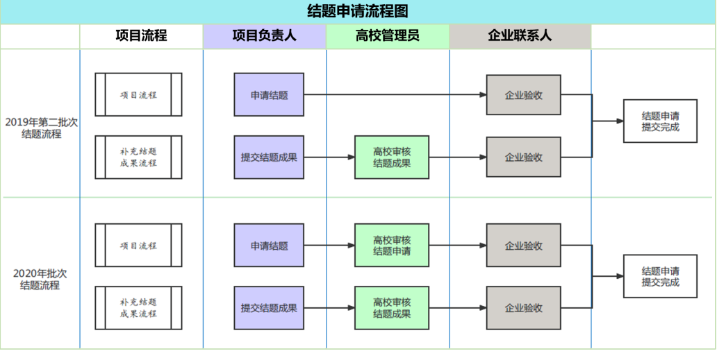 对于2019年第二批项目,由高校管理员完成结题成果审核;对于2020年批次项目,由高校管理员完成结题申请审核及结题成果审核。